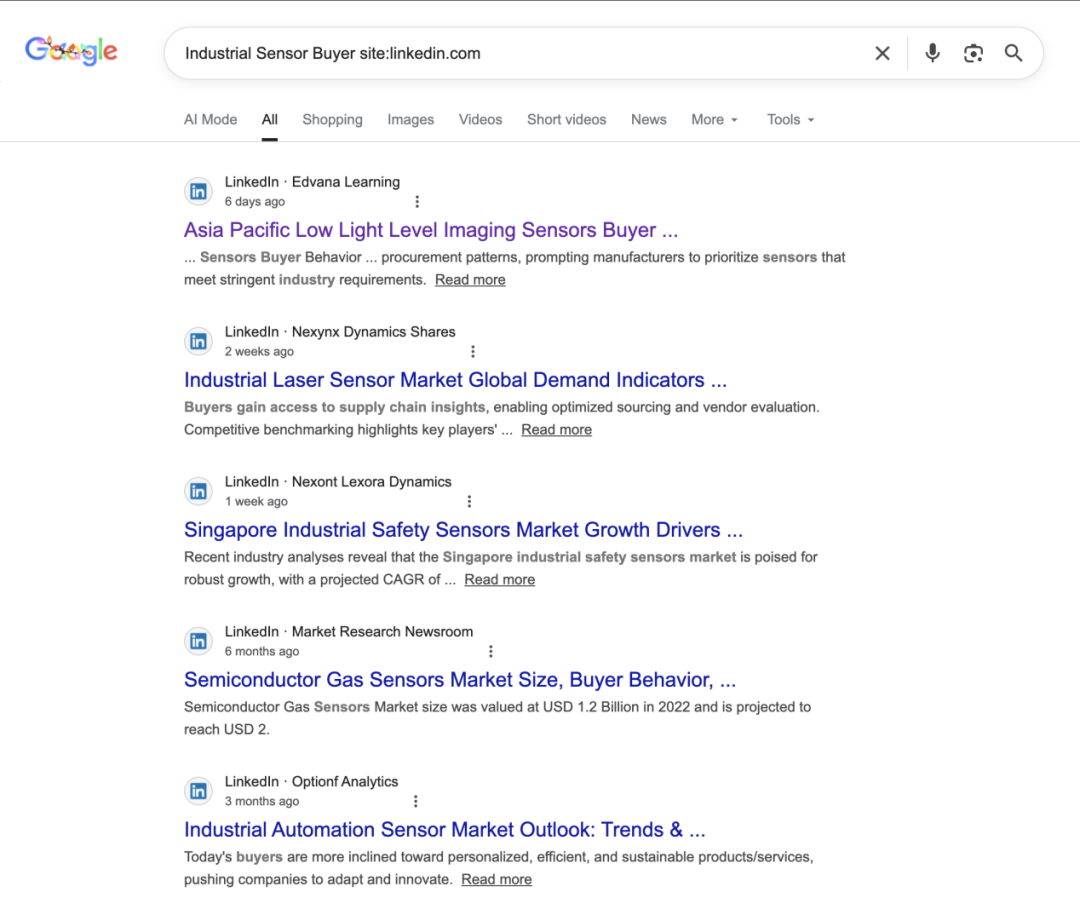 关键词 site:linkedin.com,(这里的关键词是你想要搜的行业/客户/产品相关的关键词),通过站外搜索解锁三度以外用户。
