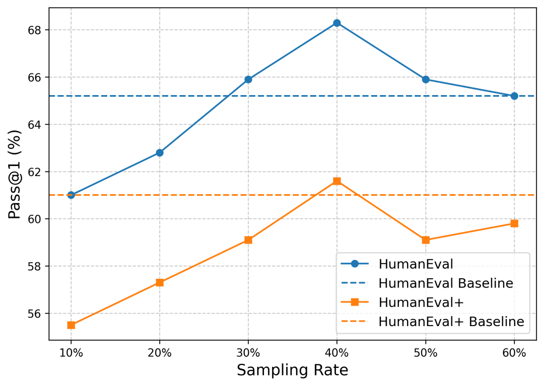 图 3 揭示了一个有趣的现象:随着采样率提高,性能并不是无限增长的。在 40% 左右达到了一个黄金平衡点。这暗示了数据集中存在大量的“噪声”或“垃圾信息”,过多的低质数据反而会干扰模型的学习。