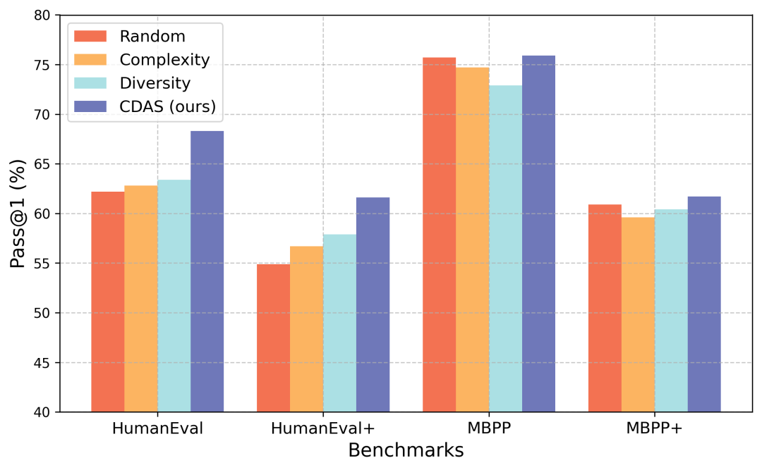 图 2 对比了随机采样(Random)、仅看难度(Complexity)、仅看多样性(Diversity)和 CDAS(Ours)。可以看到 CDAS 在 HumanEval、MBPP 等主流榜单上均稳居第一,证明了“难度+多样性”缺一不可。