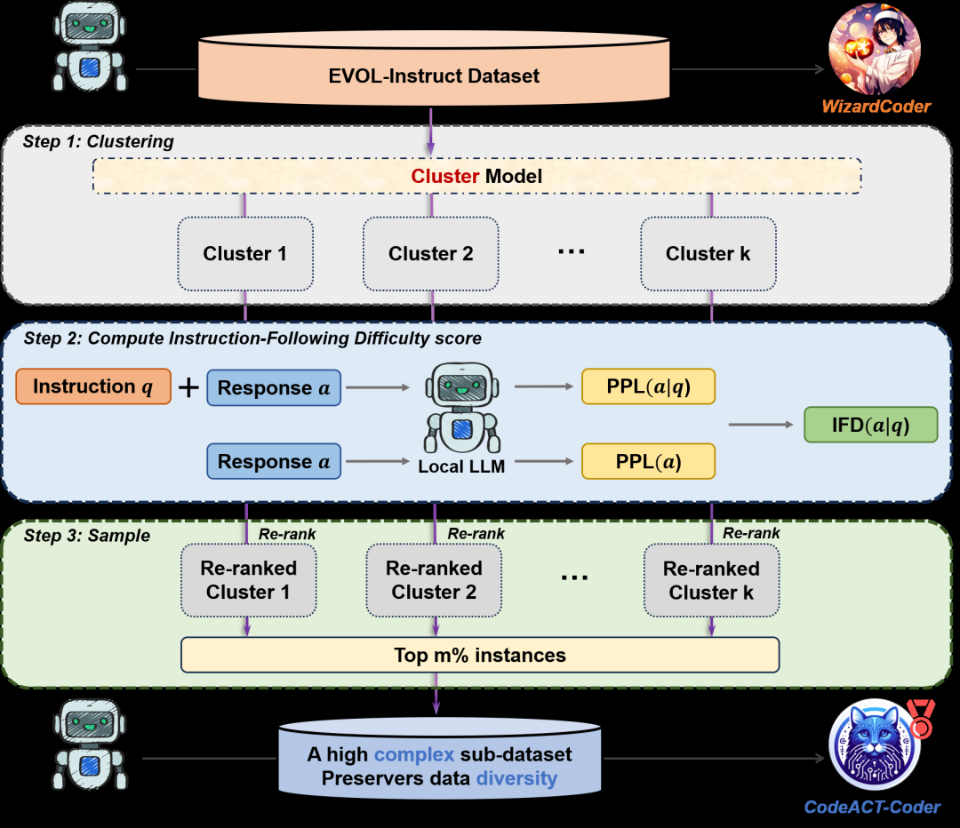 图 1 展示了 CDAS 的完整工作流:首先通过聚类(Clustering)保证多样性,然后利用本地模型计算 IFD 分数来识别难度(Complexity),最后对每个簇进行重新排名并采样。这种“模型自我打分”的方式彻底告别了对 GPT-4 的昂贵依赖。