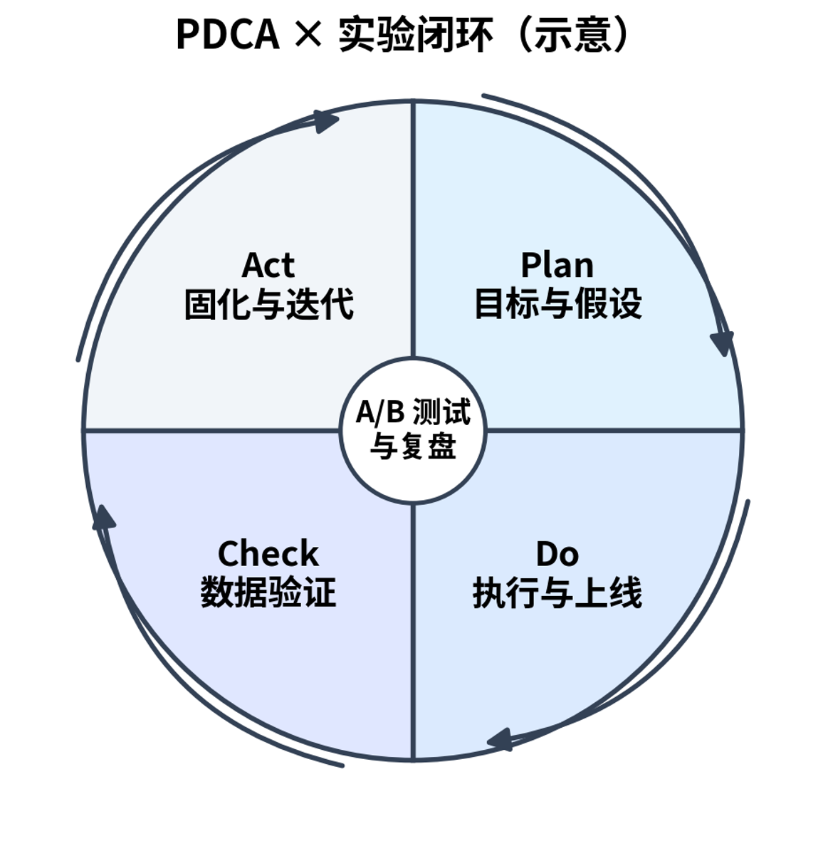 PDCA(计划-执行-检查-行动)提供了通用的改进闭环,可与 AB 测试结合。
