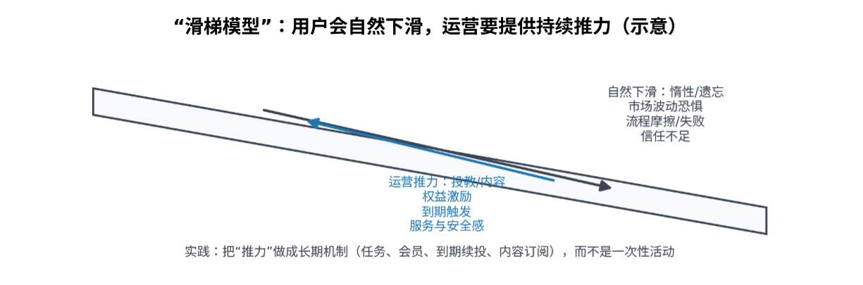理财用户会因为惰性、市场波动恐惧、流程失败、信任不足而“自然下滑”。