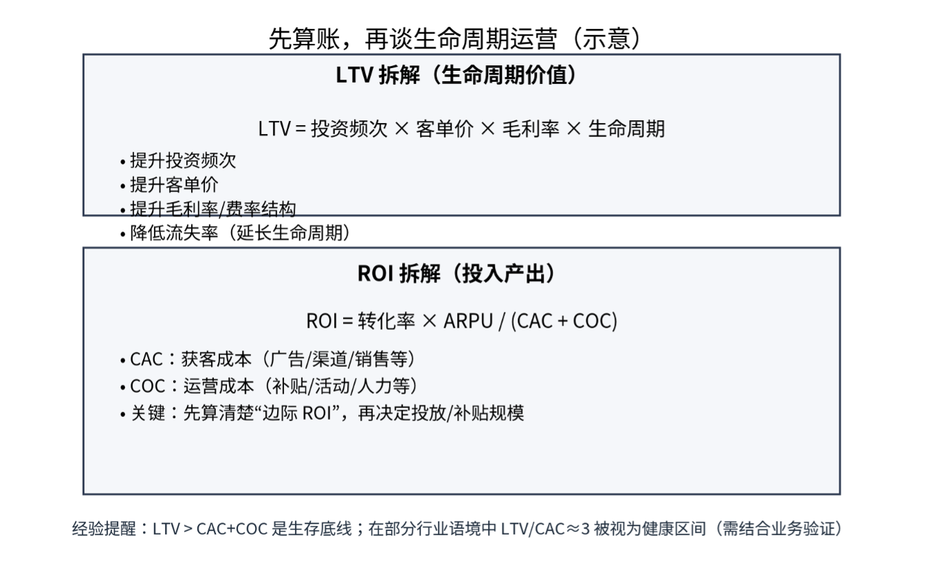6. 生命周期运营:先算清 LTV/ROI,再谈分期策略