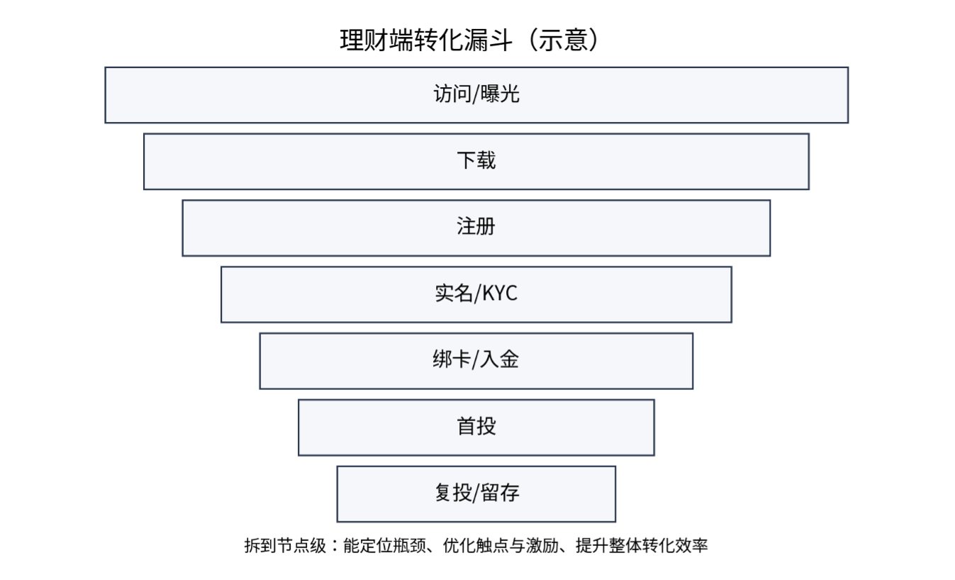 漏斗的价值在于:让问题可定位、让策略可验证。对理财业务而言,漏斗通常不止一个(主线漏斗 + 平行漏斗)。