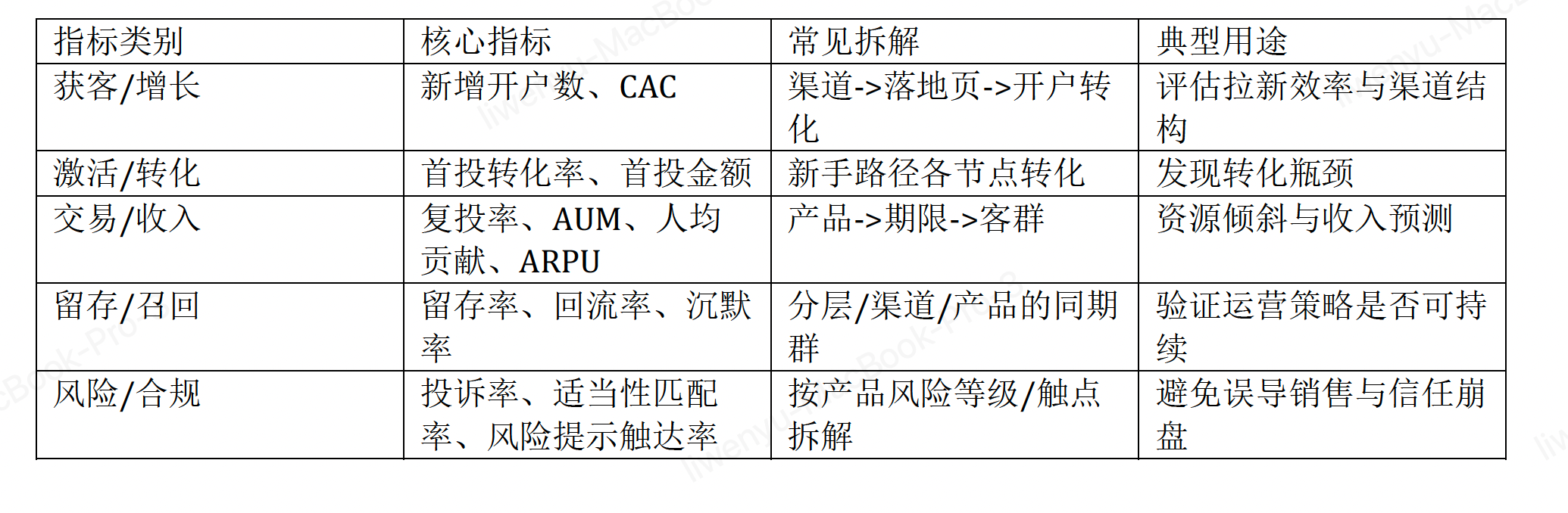 理财业务应在 AARRR 之外补充“风险/合规护栏指标”,避免以牺牲信任换短期增长。