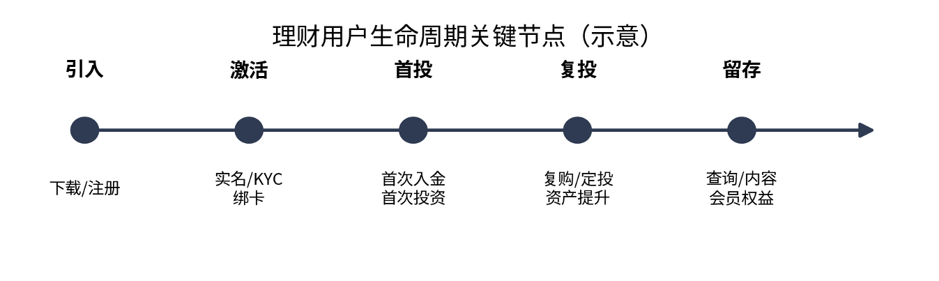 生命周期不是时间分段,而是行为分段。建议把理财主线拆成:下载/注册/实名/绑卡/入金/首投/复投/到期/赎回/分享等节点。