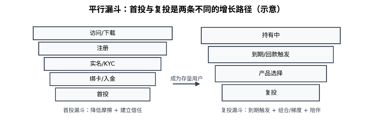图11:平行漏斗(示意):首投漏斗 vs 复投漏斗