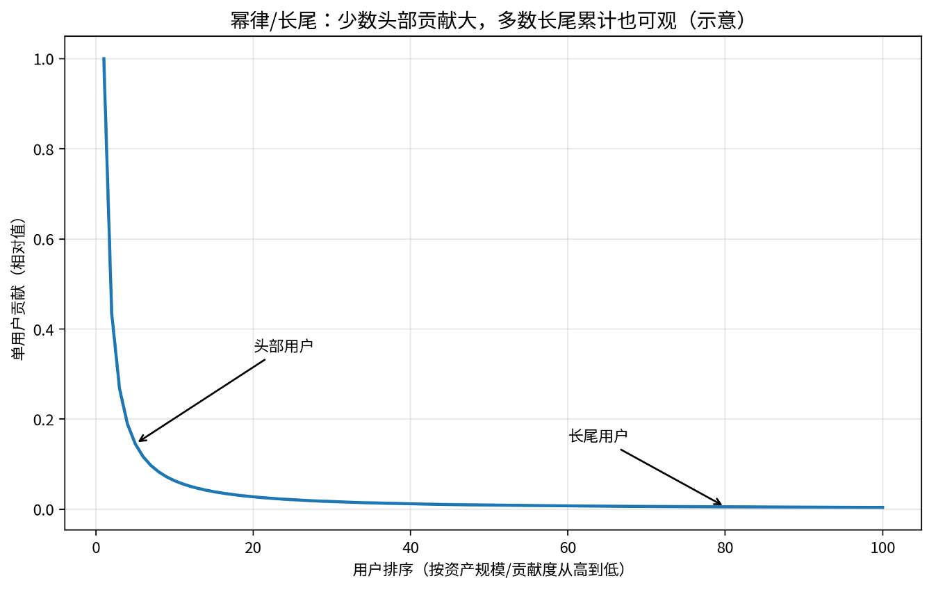 图4:长尾/幂律分布示意:少数高资产用户贡献大部分 AUM