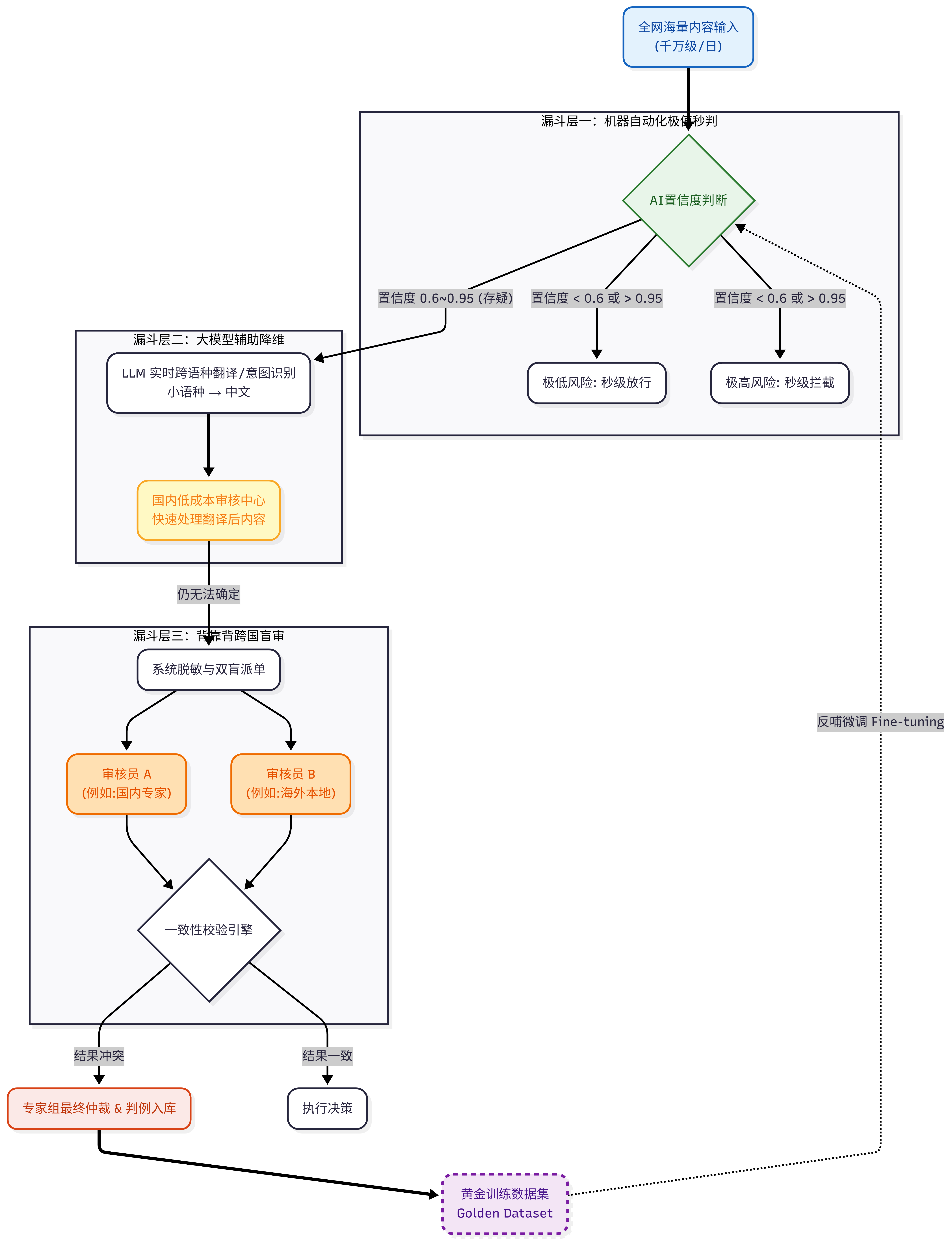 业务解法: 专家组仲裁出的每一个艰难判例,都不会被浪费。它们会被系统自动标记为高价值的“黄金数据集”,用于对第一层漏斗的 AI 模型进行微调。