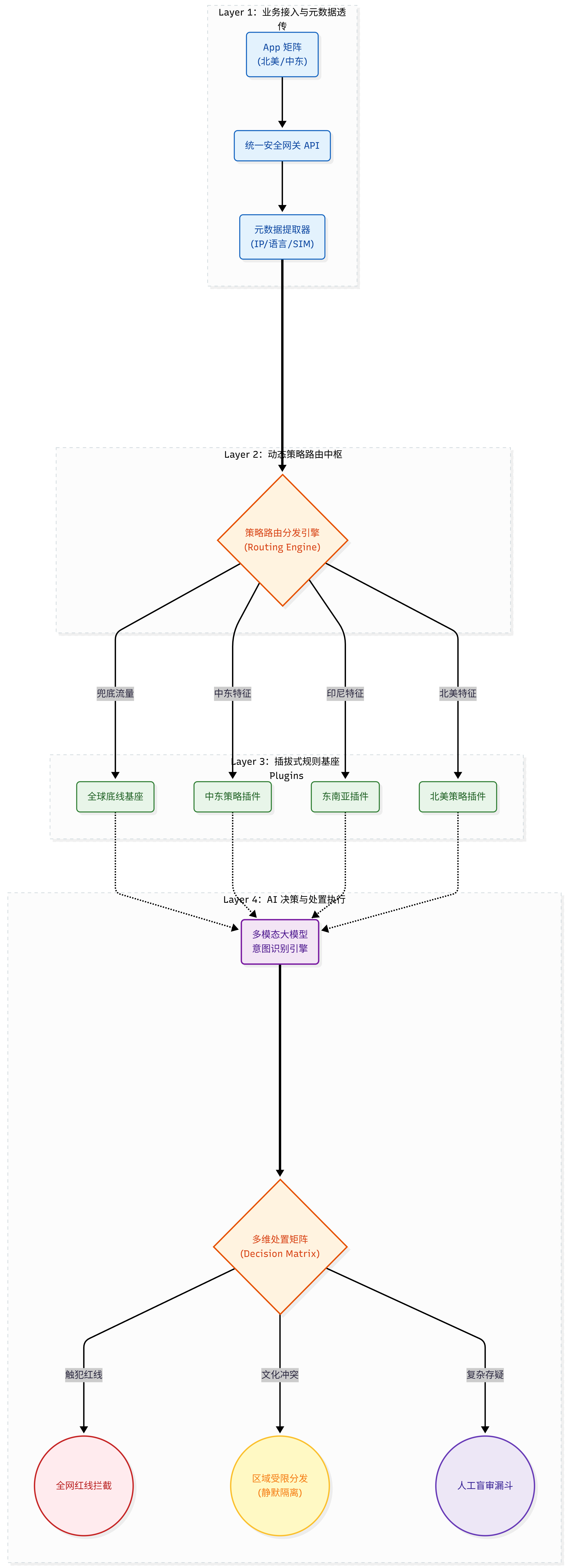 - 本地化策略插件: 包含印度的政治敏感词、中东的宗教习俗、东南亚的博彩规范等。这些地域性规则被封装为独立的“策略包”,只有当用户命中特定区域时才会被加载。