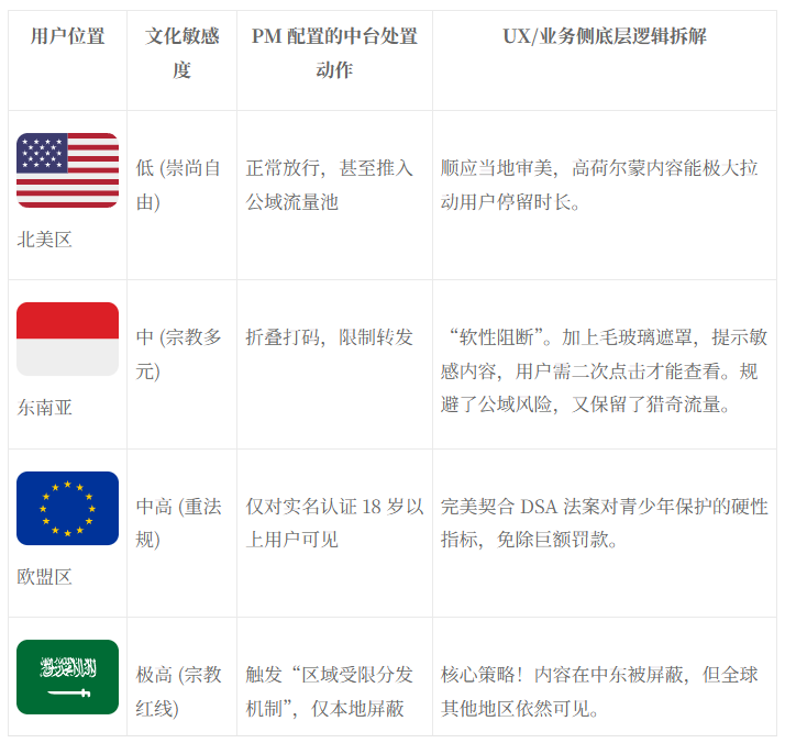 举个最直观的实战案例:一条女性穿着瑜伽裤健身的短视频。在北美区,这类内容互动率极高,算法通常会将其推入公域流量池以拉动日活;但如果不做区域隔离,让这条视频被系统分发到了沙特区,不仅会引发当地用户的强烈投诉,产品甚至会在第二天收到监管机构的严重警告,面临 App 封网和支付通道被切断的极端风险。