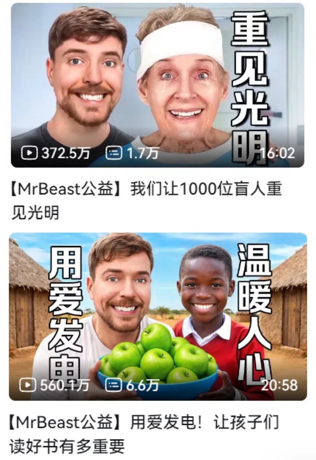 同时,野兽先生的视频还常有公益元素。在他的内容中,将做好事与观众联动起来,去非洲帮助孩子们办学校,每增加一个播放量就能让孩子们多一口饭吃;救助1000只动物,给长颈鹿打疫苗、从废墟的动物园救出狮子;召集千名创作者,在贫困地区打水井,让200万人喝上干净的水。