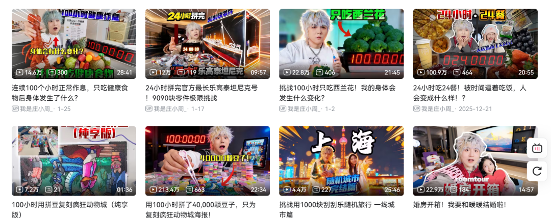 除了@飓多多 ,还有许多其他的猎奇挑战的创作者也十分亮眼。“挑战100小时”系列的@庄小周 ,连续100小时只吃西兰花、100小时拼豆40000颗等挑战,将日常行为放大化,用夸张到极致的数量来体现自身的体力、毅力乃至胆量的极限。
