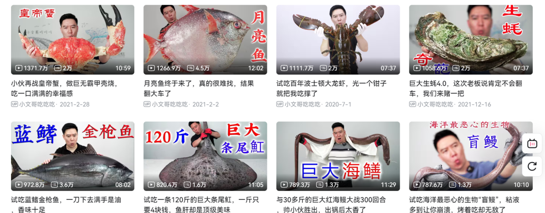 在美食领域,同样不缺乏博人眼球的,例如经常豪掷千金品尝猎奇海鲜的u主@小文哥吃吃吃 。在他的视频里,金钱转化为了极其稀有、昂贵的食材,撒钱行为体现在对顶级食材的毫不吝啬的购买和享用上。观众在收看时,便会收获一种关于“奢侈味觉”的猎奇满足。