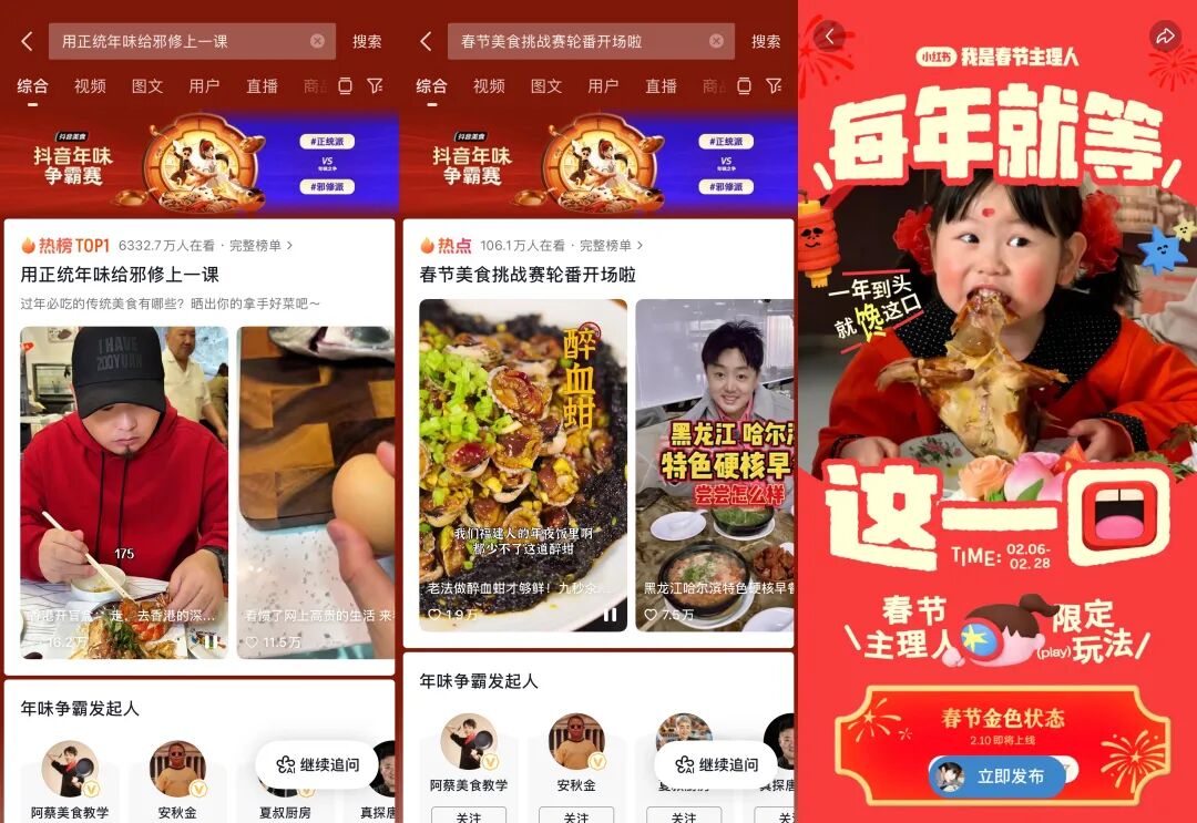 截至发稿前,抖音话题#抖音年味争霸赛 已超35亿播放,#春节美食挑战赛轮番开场啦、#用正统年味给邪修上一课等相关话题纷纷上热榜;同时,小红书也发起春节主理人限定玩法, 吸引不少创作者加入其中,分享属于他们自己的年夜饭大餐。