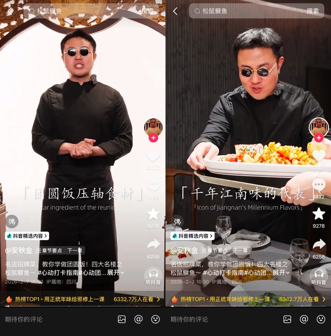 比如,@安秋金 联合苏帮菜第六代传承人、中国烹饪大师杨红,在抖音发布的《松鼠鳜鱼·苏州团圆饭压轴菜》教学视频。