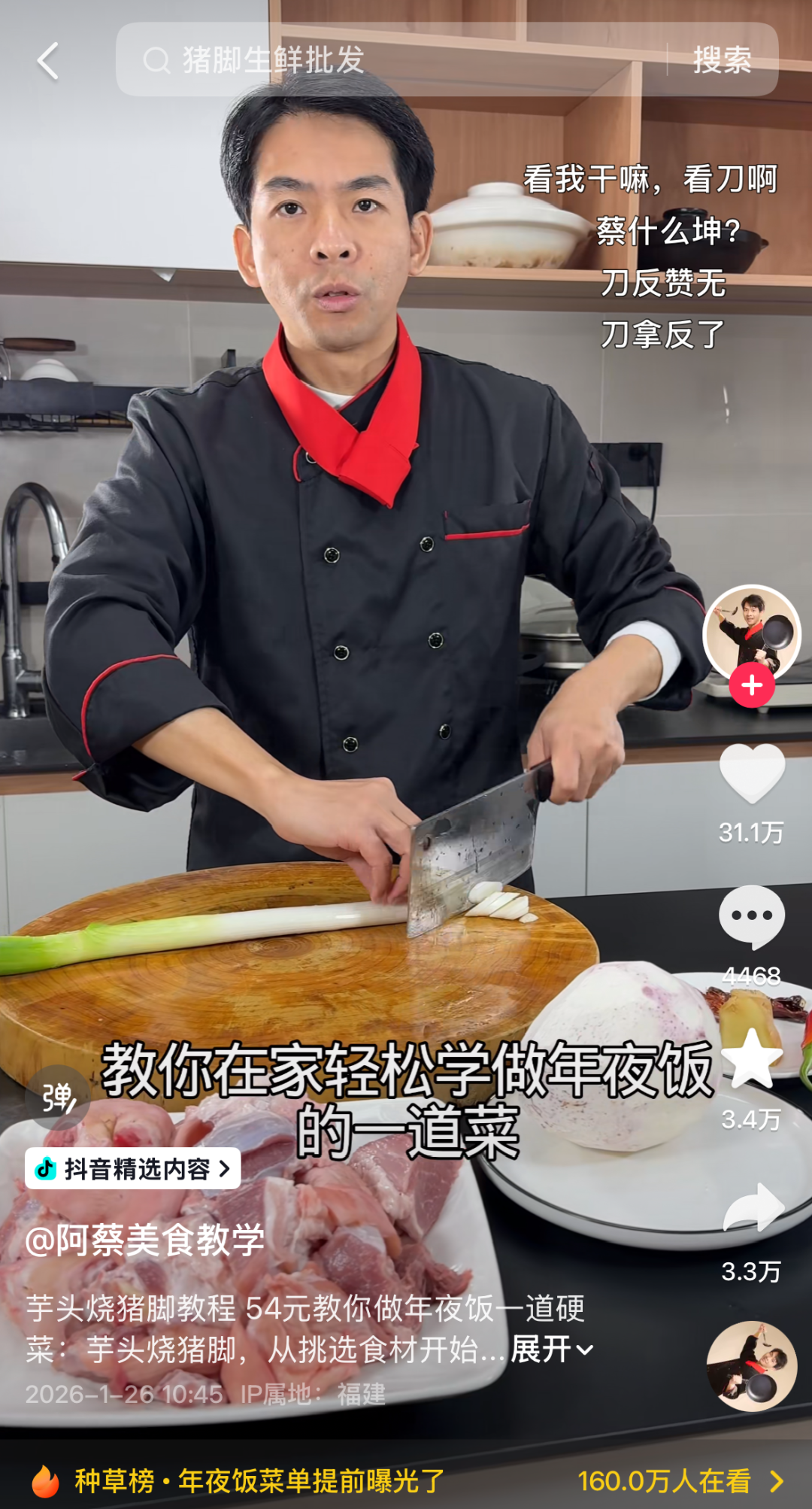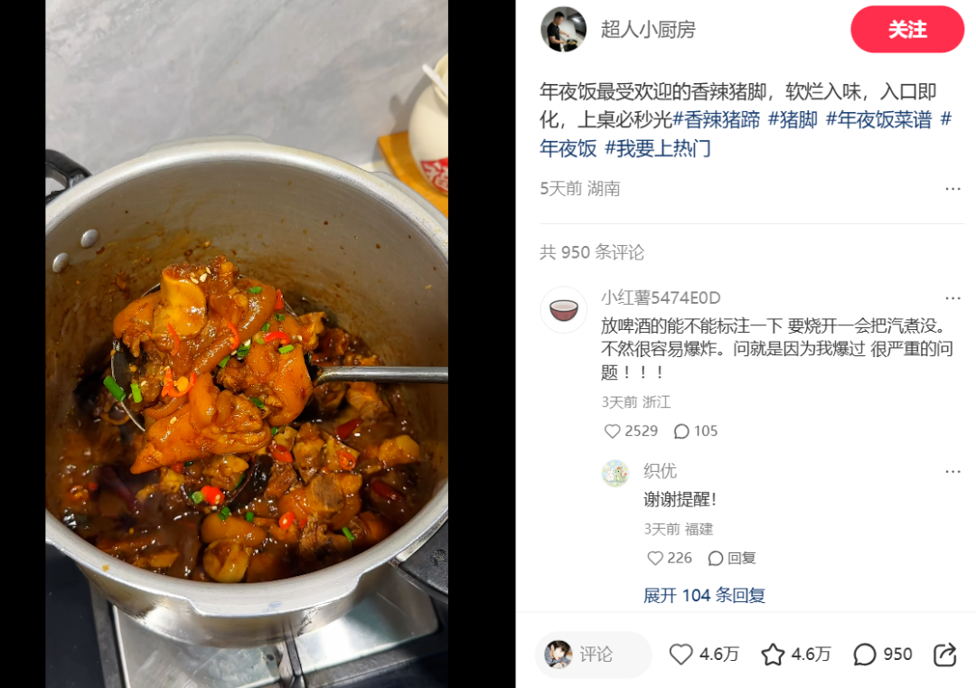 小红书创作者@超人小厨房 则凭借一道“香辣猪脚”出圈:软烂入味、入口即化,搭配秘制辣卤配方,被网友称为“年夜饭必做硬菜”。