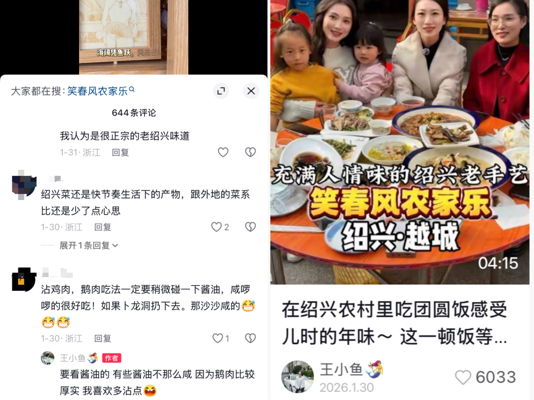 例如,@王小鱼🧜分享的绍兴农村团圆饭,酸酸甜甜的糖醋排骨、熏到天灵盖的绍兴三臭、浓油赤酱的醋溜鱼,每一道都是地道的绍兴家常味,院子里家人忙进忙出的身影、孩子们的欢声笑语,能让浙江网友瞬间想起儿时的年味。