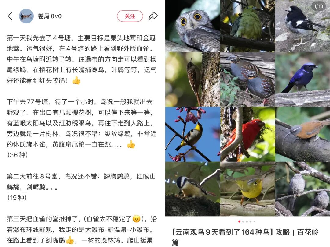 在小红书搜索“观鸟”,关键词下的内容不仅有各种精致可爱的鸟图分享,还有各种入门指南、观鸟路线总结、文创产品,和各种鸟类meme图。即便是一张糊图,也会吸引大量同好前来认鸟、炫鸟。