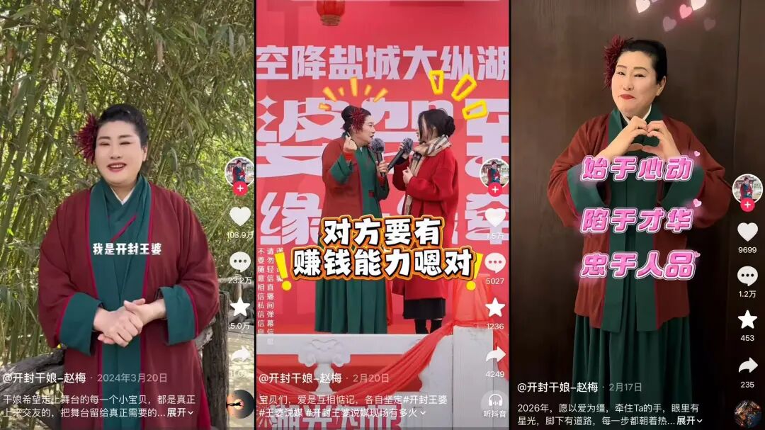 2024年年初,河南开封万岁山武侠城,头戴红花、身着一袭红绿相间裙装、以经典媒婆形象亮相的“开封王婆 ”凭借一档现场说亲节目爆红网络,在抖音账号单月涨粉624万之余,也成功杀入年轻人相亲场,让“媒婆”这个古老的职业符号完成了年轻化转身。