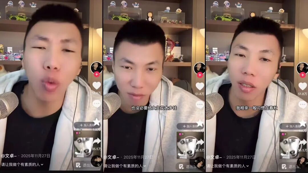 如有男生在连线时称:“钱是给女人看的,不是给女人花的”“我相亲习惯在春秋天,因为我感觉一个女孩愿意跟你回家干农活,就是一个能正经过日子的人”,文卓一边听一边扶额叹气,最后终于忍不住一顿暴力输出,相关切片获赞超50万;