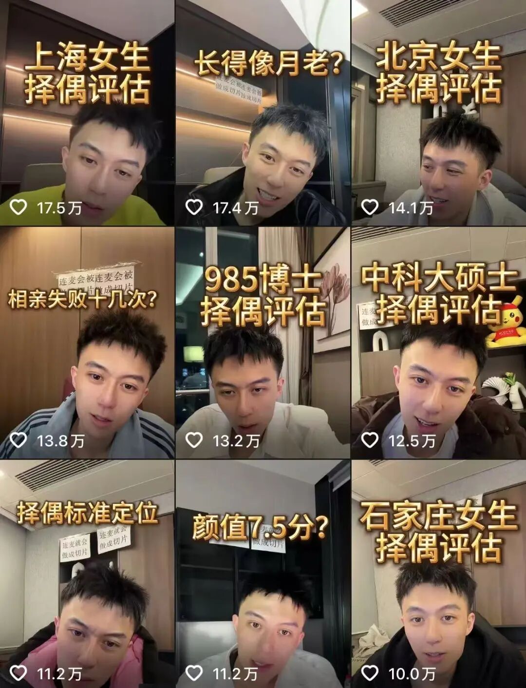 有男生在连麦时张口闭口“我妈说”,择偶基准均围绕着妈妈的意见展开,而当@文卓- 问他是不是“妈宝男”时,他却矢口否认,称“我妈说我不是”;还有大姐直接给文卓打电话,让他为自己还没离婚的闺女找另一半,称“我闺女一个人带孩子没法过”……除了以吐槽、切片的形式将这些案例呈现给用户外,他也会以情景演绎的形式还原线下接待客户时遇到的各种奇葩场景,精准的吐槽和表演吸引了众多用户驻足。