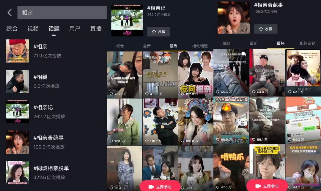 在内容平台上,与“相亲”“婚恋”这一话题相关的内容,永远吸人眼球。以抖音为例,“相亲”话题下涌现出了各种类型的视频,总播放量超过500亿次,足以见流量之庞大。