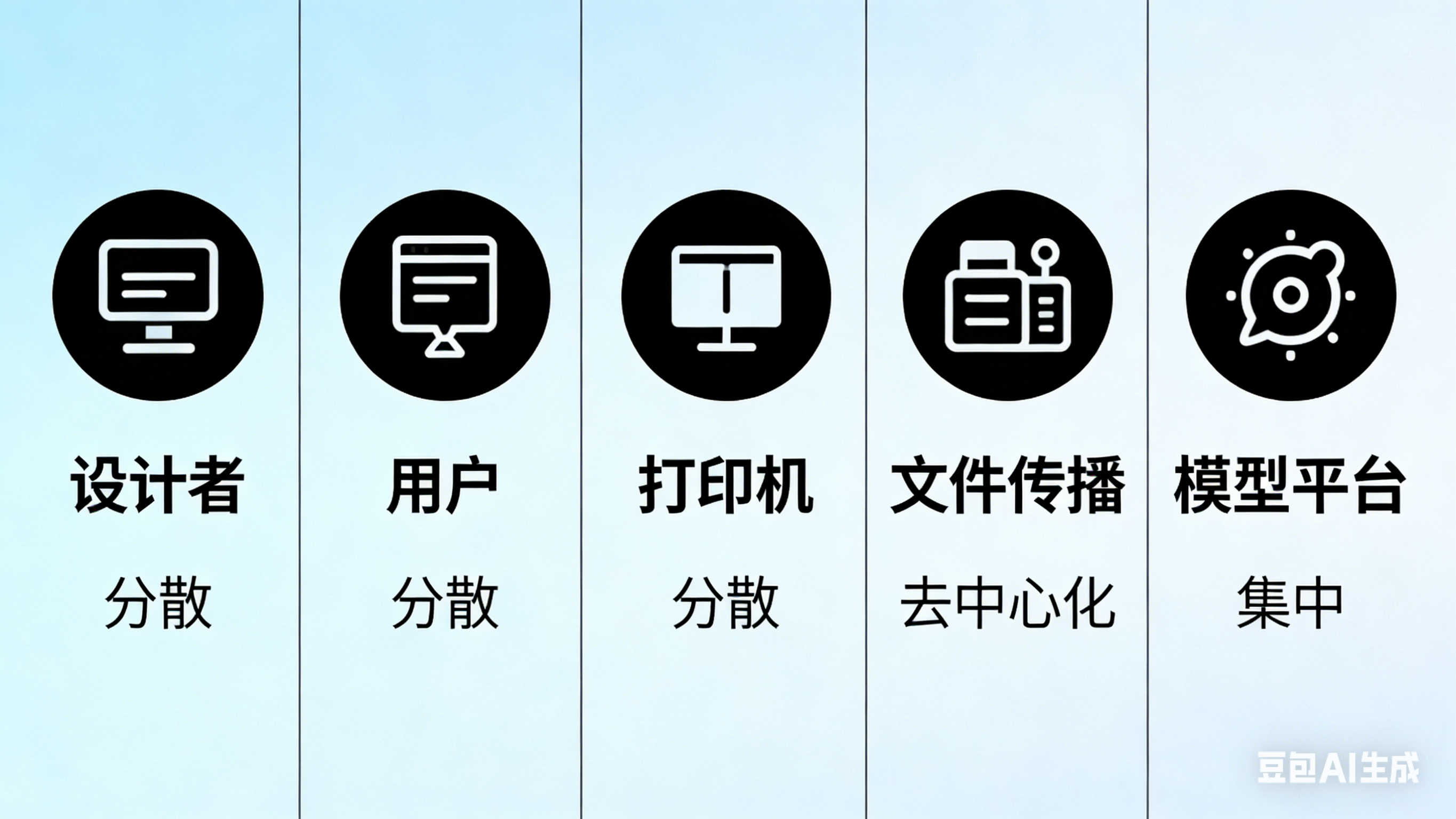 制造链条:设计 → 模型平台 → 用户 → 打印机 → 产品