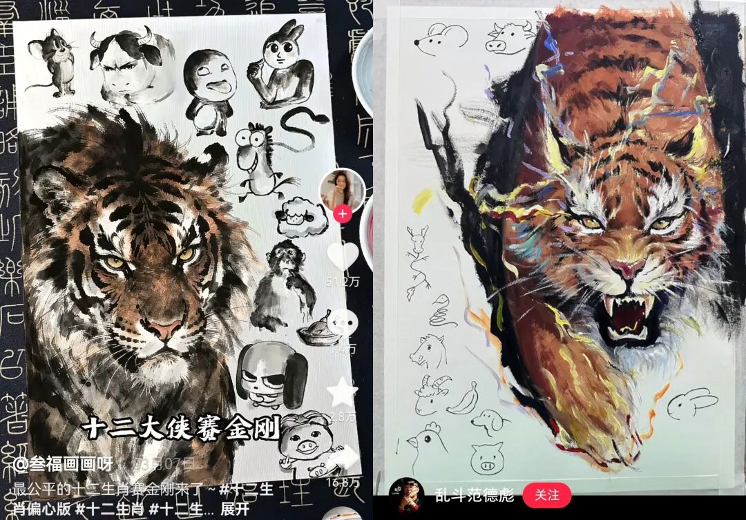 但很快,偏心从被动变成主动,从失误变成创作理念。 网友们发现,这种“双标”极具戏剧效果!当虎年博主把老虎画得威风凛凛、细节拉满,旁边的鼠牛兔龙却像是简笔画速成班出品,强烈的反差萌瞬间击中观众笑点!