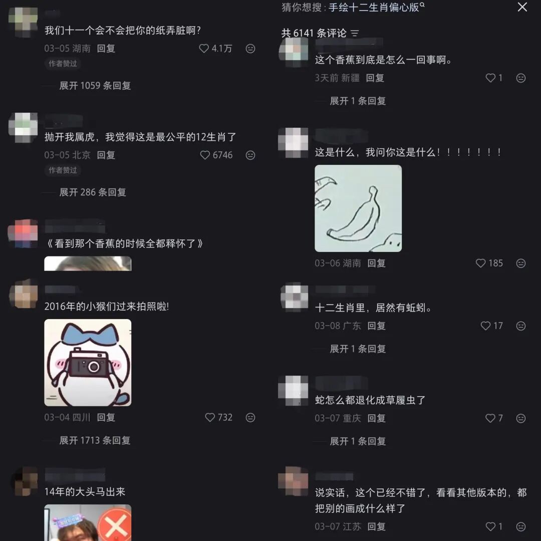 网友们在评论区互相破案作者的属相,分享自己的创作思路,吐槽自己对其他生肖的敷衍,甚至发起“同款属相集合”的互动,让原本陌生的网络空间变得充满温度。