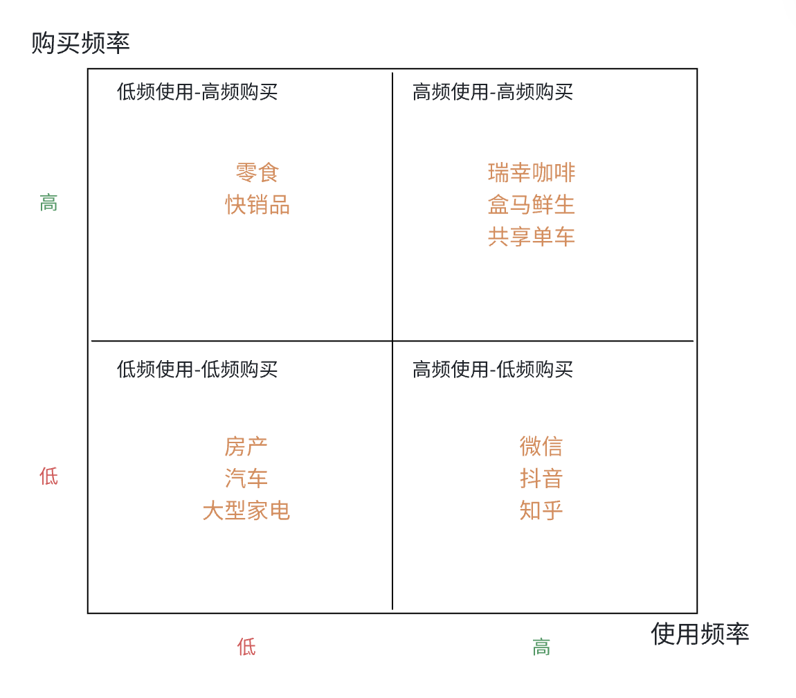 这个四象限图的横轴是「使用频率」(高频/低频),纵轴是「购买频率」(高频/低频)。