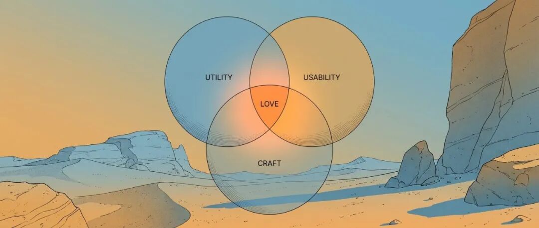 Eismann 的核心框架是一个韦恩图,三个圆分别是:有用(Utility)、好用(Usability)、精致(Craft)。三个圆的交集中心,就是”Love”——用户真正爱上你的产品的那个区域。