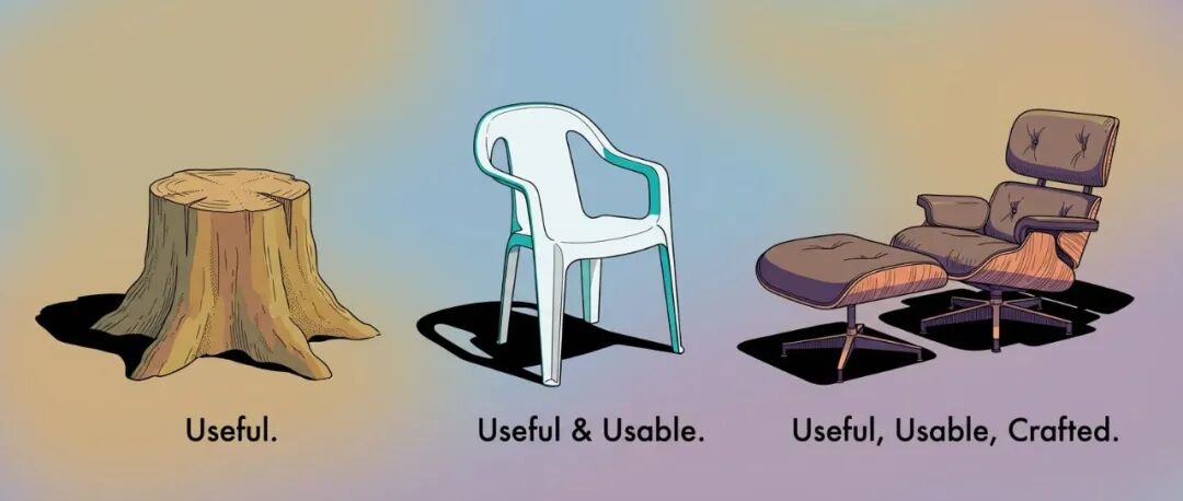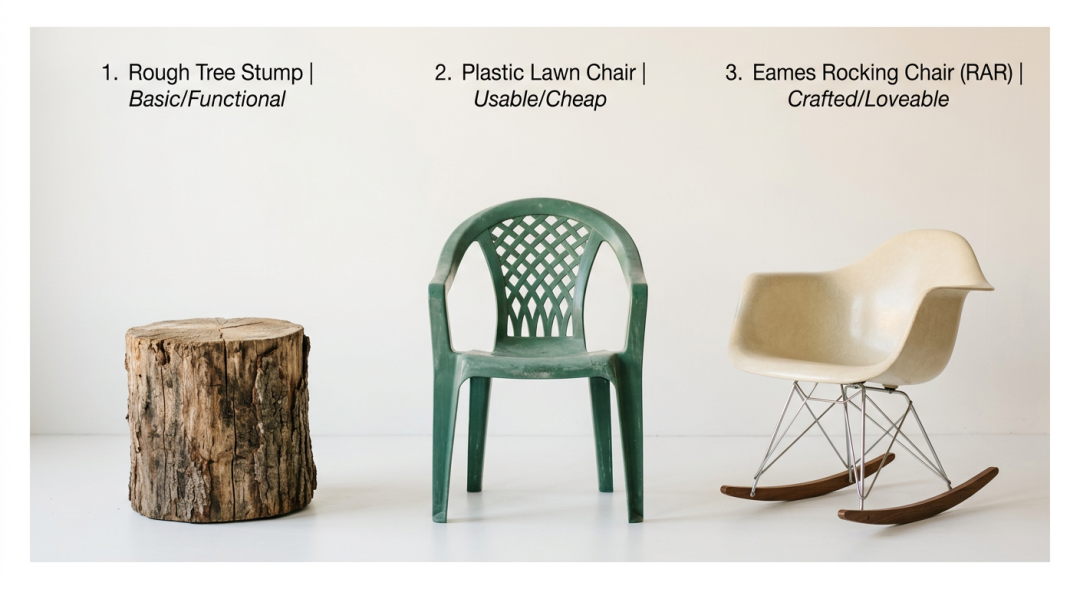 一截树桩是完全合格的椅子——能坐。一把绿色塑料椅是好用的椅子——轻便、可移动、可堆叠。但一把 Eames 摇椅是另一回事:皮质细腻、木材温润、设计经典、坐感舒适到让人上瘾。人们愿意为它支付高价,甚至收藏它。