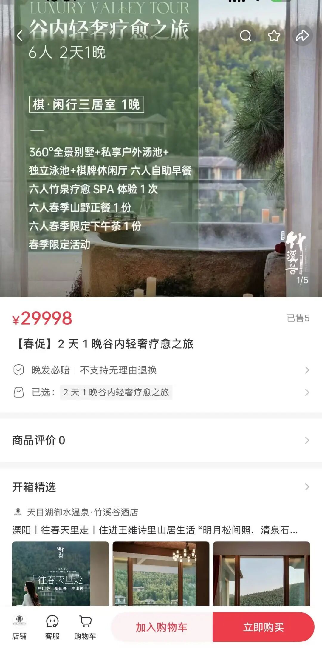 更“轻奢”的版本就是疗愈民宿套餐了。两天一夜打包颂钵体验、山野正餐、限定下午茶,标价29998元,显示已售卖5单。