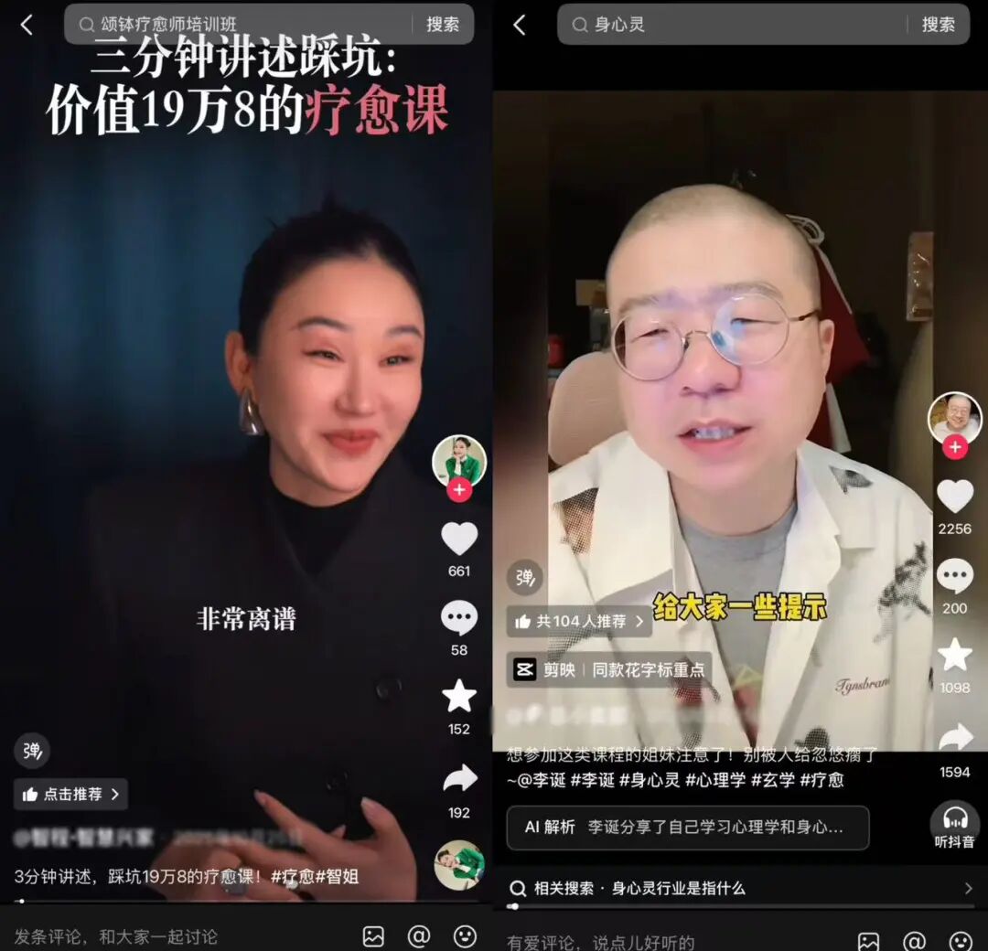 最后的推波助澜来自从业者的“专业话术”。 “β波调节”“矿石元素融入”“身心灵对齐”等专业包装,让消费者难以判断真伪。平台也会推荐大量的内容给用户,因此疗愈视频在推荐机制下获得大量曝光,进一步放大了需求。