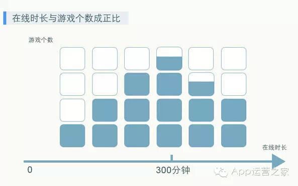 当玩家每日在线5小时内时,在线时间越长,玩家的游戏个数就越多。此时玩家注意力较为分散,对各款游戏均属于蜻蜓点水式操作。但当超过5小时游戏时间,玩家更倾向于将全部时间投入到自己钟情的游戏之上。