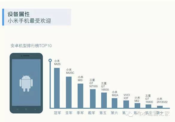 在设备属性上,安卓机型TOP10中小米跻身前三甲,独占6个席位,三星阵营尚保留三款机型,最后一个名额被国产手机vivo抢占(排名第七)。较高性价比的小米手机,俨然已经成为手游玩家的主流选择。