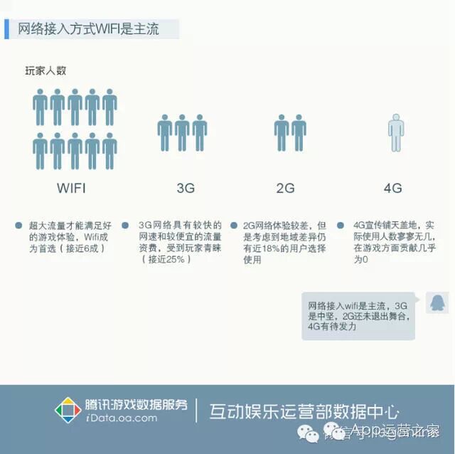 目前3G网络和2G网络用户占据大半,而4G用户比例仍未体现较高增长。因为国内网络分布的情况,手游玩家大多选择使用WIFI进行游戏。