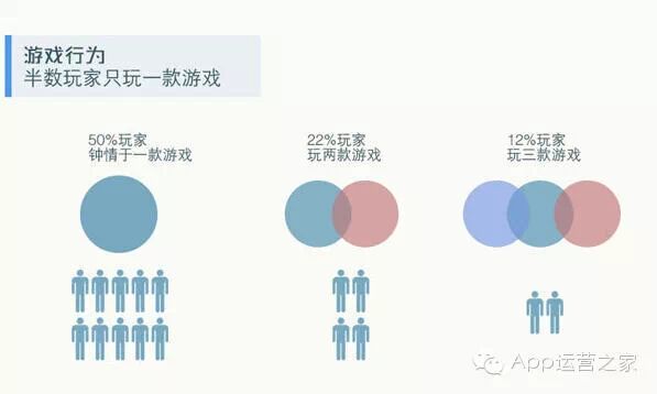 从2013年底到2014年,随着手游总数量的增加,玩家热衷的游戏个数却始终保持稳定。其中半数玩家只热衷单一款游戏,可能需要归结为用户精力有限,无暇顾及太多选择。