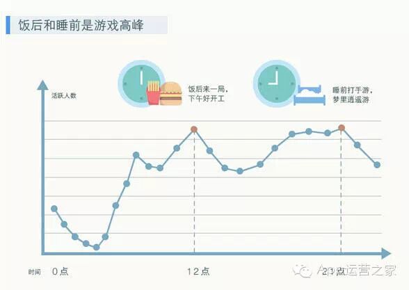 从用户时间上分析,玩家的游戏时间与作息时间有较强的一致性,在午饭后(12点)及睡觉前(21点)均出现了游戏活跃的峰值。从下午3点工作、上课期起,玩家人数呈现下滑趋势,而在凌晨到4点区间,用户活跃度显著变少。