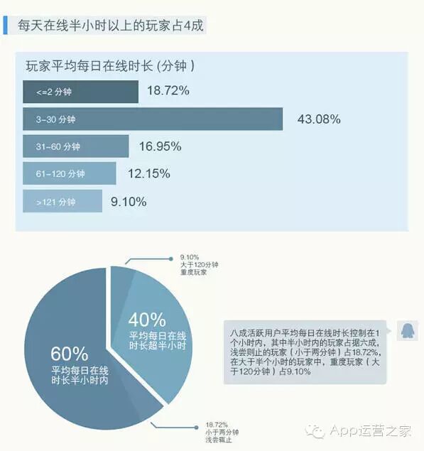 八成的活跃用户每日平均在线时长均控制在1小时之内,其中半小时内用户占六成,而低于两分钟在线的玩家占18.72%。在大于半小时的玩家中,重度玩家(大于120分钟)占9.1%
