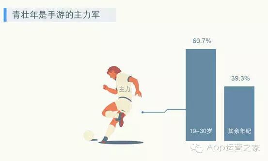从年龄层分析,60.7的手游活跃用户年龄在19-30岁之间,构成了手游主力军。然而其他年龄层占据了39.3%的比例,仍旧具有市场发展潜力。