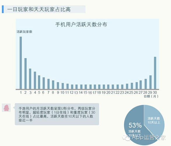 手游用户的月活跃天数呈U形状分布,两极化呈现明显。超轻度玩家(1日在线)和重度玩家(30天在线)占比最高,活跃天数在十天以下的人数接近一半。