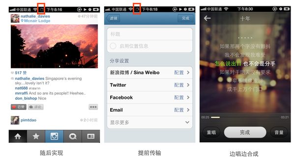 在Instagram 拍完照片后,点击上传后,它的处理方式是回到首页的位置,告诉你的照片正在提交,并不是显示一个上传进度的界面,让用户看那上传百分比。因此,我们在设计米吧上传歌曲文件时也只是告知用户后台正在帮你上传,叫用户放心,用户自然就会去玩其他的功能,没有让用户焦虑的等待,等上传完毕时,我们再用Toast list通知用户已经上传成功,这样把查看上传结果的主动权交给用户。