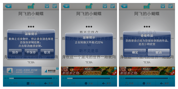 K歌达人第二版的弹框就是模态处理,界面很不友好,用户在K歌过程中要被打断三次才能发表一首自己唱的歌曲,所以降低了用户的参与度。
