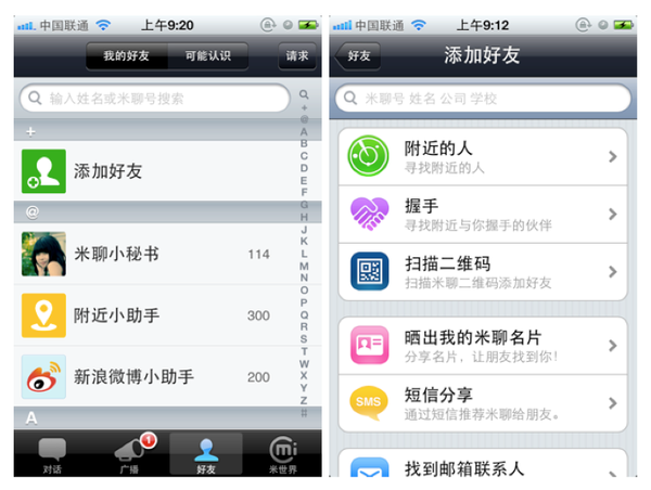 对于一个社交即时通讯产品,添加好友的功能是好友汇聚的来源,虽然米聊微信都绑定手机通讯录,但话又说回来,用户找手机通讯录联系人语音聊天的还是比较少。添加好友是引导用户去发现好友,找好友, 碰好友的一扇门。所以对于这么重要的功能放置在应用程序的哪个位置,在产品前期就会让用户明显的去选择用哪个应用,因为聊天工具的前提是要有人和你聊天。再回到现实的界面中来,看看下面的对比: