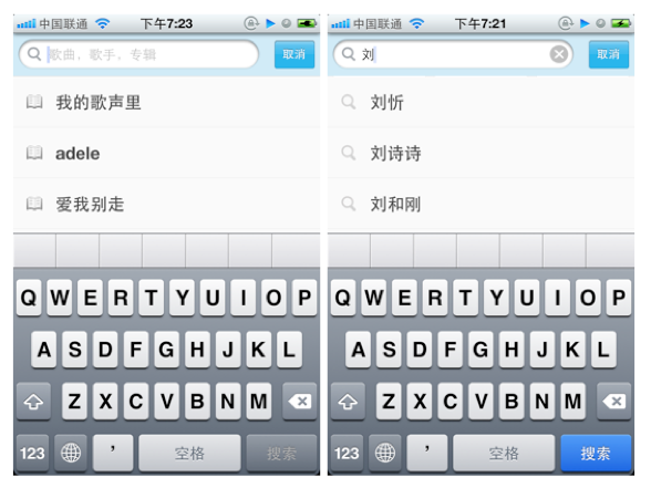 百度音乐的搜索先是把近期最热门的歌曲依次排列在列表中,当有字输入时,会出现歌手的候选词,这里值得称赞的是百度音乐的搜索能根据用户输入的字来判断用户是搜索歌手还是歌名。