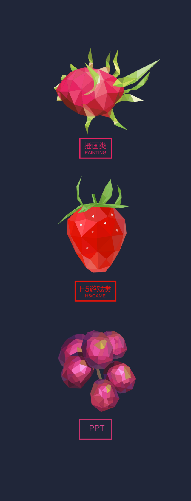 考虑到各部分需求间的流程都是大同小异,在固定的几个模块基础上进行必要的增减,并选择七种不同的水果对应七类需求: