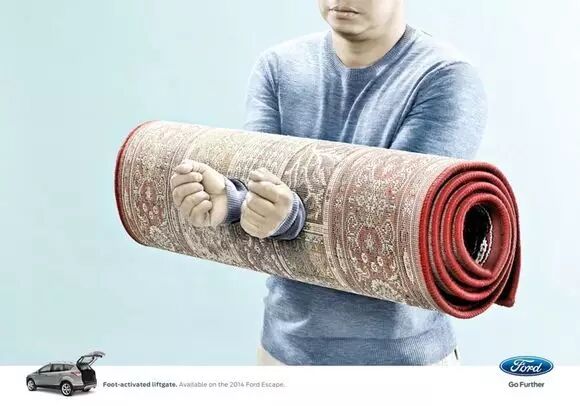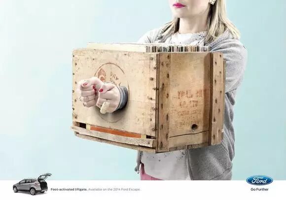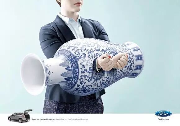 福特翼虎广告:手被禁锢住了,后备箱怎么开?福特翼虎告诉你,只要带了车钥匙,用脚踢下车屁股就能开后备箱了。