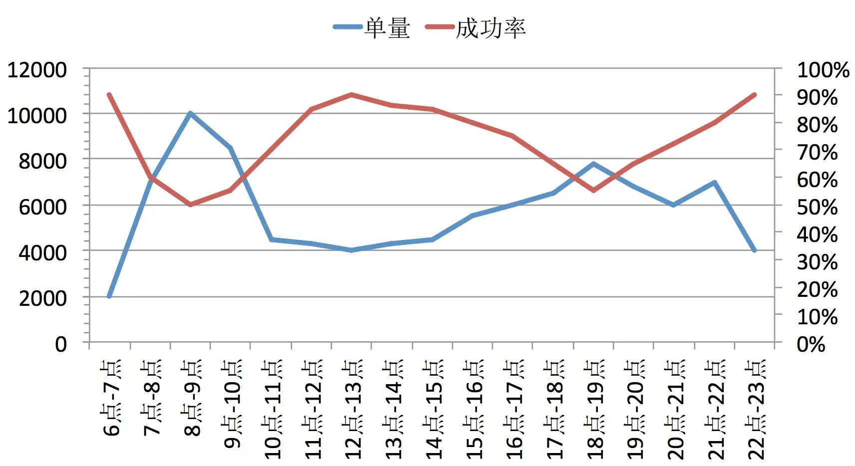 这个例子再延伸一下。如果把打车软件的在一天中不同时间的订单量和下单成功率画出来,估计是这样子的(根据个人经验画的,如有雷同纯属巧合):